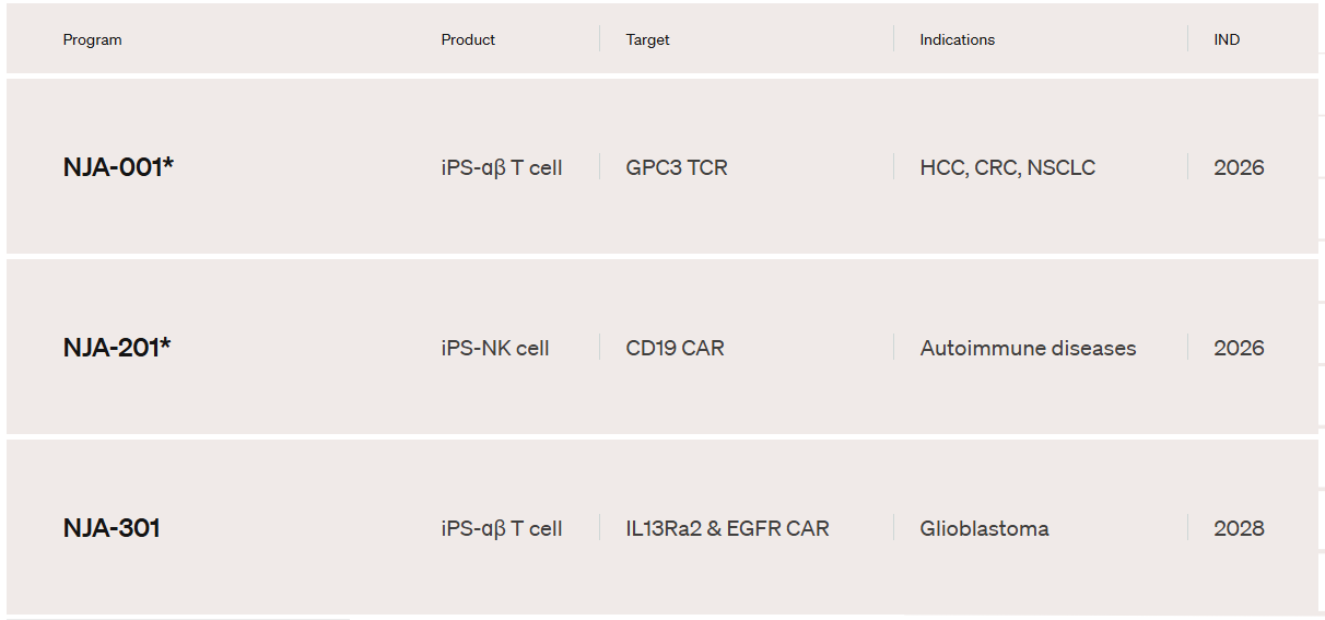 - Shinobi's lead program, NJA-001, is an iPSC-derived CD8αβ T cell therapy targeting GPC3+ solid tumors, including hepatocellular carcinoma (HCC), colorectal cancer (CRC), and non-small cell lung cancer (NSCLC).