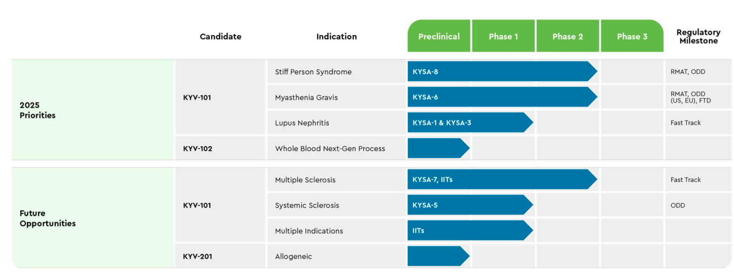 Kyverna is a clinical-stage biopharmaceutical company developing CAR T-cell therapies to reset the immune system and treat B-cell driven autoimmune diseases. Its lead program, KYV-101, is an autologous anti-CD19 CAR T therapy being evaluated across multiple autoimmune indications including lupus nephritis, multiple sclerosis, myasthenia gravis, stiff person syndrome, and systemic sclerosis. Kyverna is developing both autologous (KYV-101, KYV-102) and allogeneic (KYV-201) CAR T products, aiming for improved tolerability, deep B cell depletion, and durable remission.